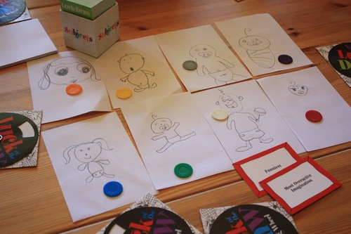 任選一玩家將所有畫紙集中洗勻後,翻至正面排列在桌面中央公區上,並在每張畫紙上任意放上一個顏色標記。接著,由另一名玩家進行擲骰,根據擲骰所示點數決定比較的主題項目數量(即主題卡張數)。由其中一位玩家從主題卡牌盒內逐一抽取一張主題卡,並大聲唸出。之後,所有玩家根據自家的投票轉輪卡進行投票,將投票轉輪卡的顏色轉至最符合主題作品的代表顏色標記